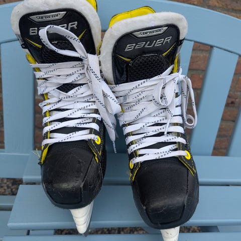 Veldig gode skøyter for juniorspillere. Brukt av datteren min i to sesonger, så det er en del merker, men alt er i orden. Slipt med standar radie for barn. Dette er en D modell som er for normalt brede føtter. Stålene er skarpe og fine. De kan bakes for å tilpasses raskere til fot.