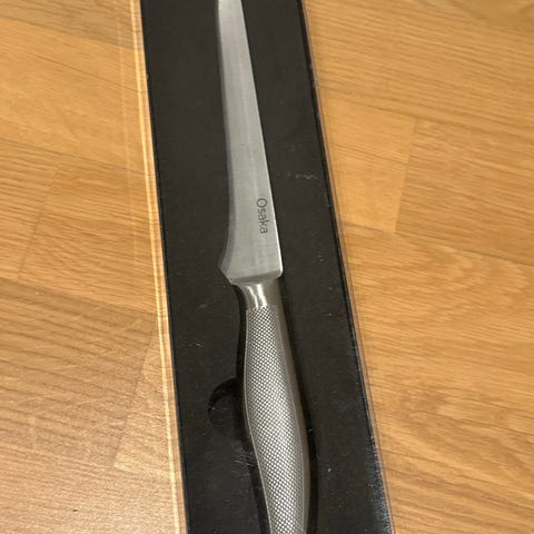 Helt ny kvalitetskniv Osaka i orginaleske selges for 350 kr. Kan hentes på Lambertseter eller sendes. Nordpost koster 69 kr i frakt. Tatt ut for fotografering.
