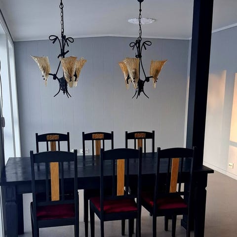 Selger en eldre spisestuegruppe med mørk sotet glassplate som er ganske helt og fint.Noe slitasje finnes men det er ganske fint.Dette er designbord og stoler men vet ikke hva det heter.Husker bare det kostet masse,har hatt det i 15år ca.Kan være behjelpelig med transport hvis du ikke bor så langt unna.Hvis interesse så ring 99289127