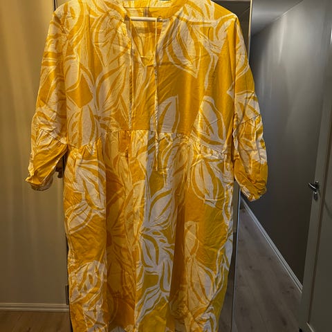 Lekker sommerkjole sort, med gule blomster. Knapper foran, splitt nede og strikk i ermer. Kjolen er str L, men tilsvarer mer en str S eller liten M