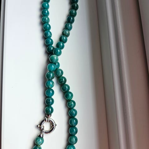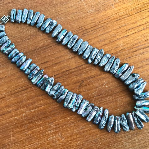 Pent vintage halskjede med lysegrønne fargede barokkperler og strass lås selges kr 450,-