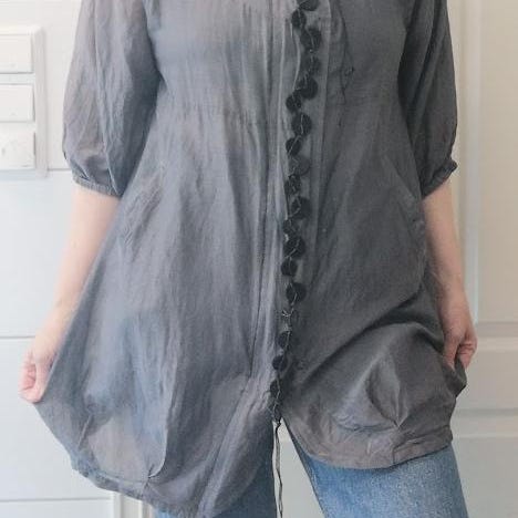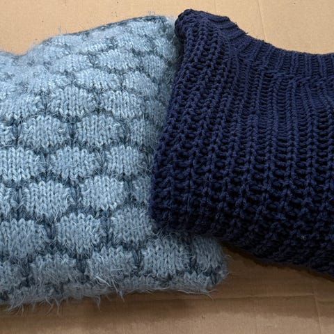 Pent brukt strikkejakke i grov strikk med skinndetajer.
