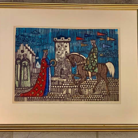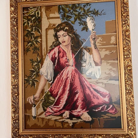 Håndbrodert kopi av baldisolteppe brodert med tynt ullgarn og innrammet med matt glass for 3 -4 år siden hos glassmester. Målene er 119cm bredde og høyden er 85cm. Veldig pent håndarbeid i halve korssting