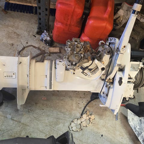 Selger en evinrude 90, det jeg veit om som er galt med motoren er gåen starter. Selges som den står.