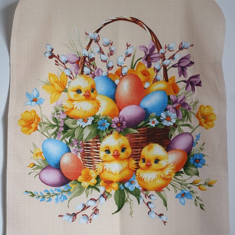 Kjøkkenhåndkle i blå farge med høner. Laget av bomull, dette håndkleet er både praktisk og dekorativt for kjøkkenbruk. Det har en god absorberingsevne og er enkelt å henge opp med de røde hemper.