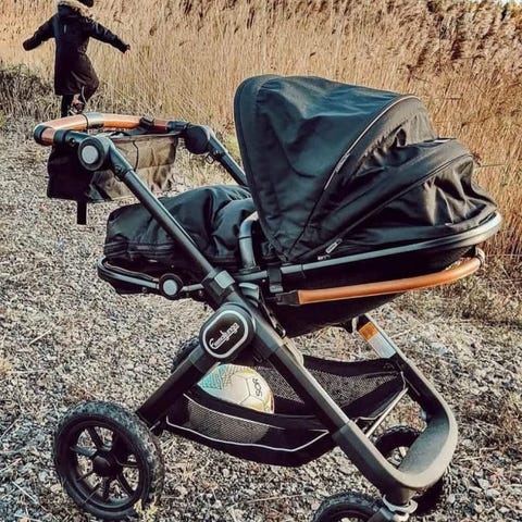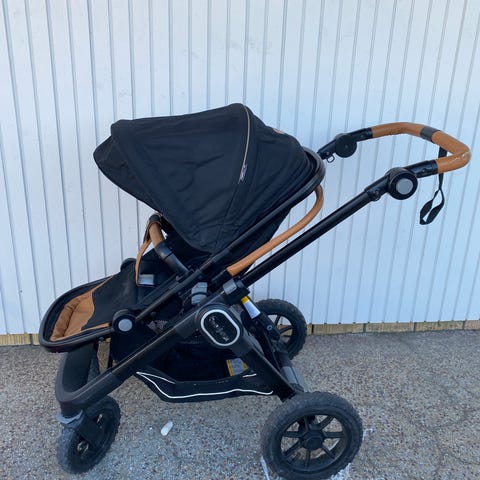 Liggedelen er svart med brune skinndetaljer som matcher understellet. Sittedelen er marineblå. Fantastisk vogn, som vi har hatt mye glede av! Ullskinn kan medfølge hvis ønskelig. Regntrekk medfølger.