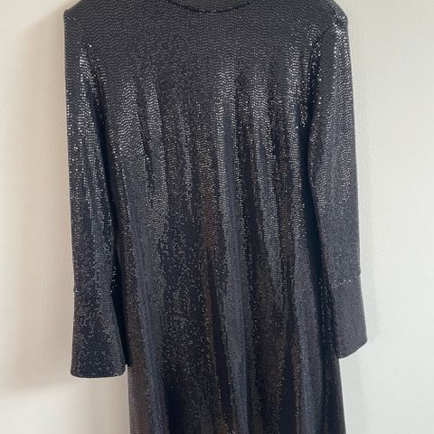 Kjolen er foret.Åpen i ryggen, lukkes med knapp bak i nakken.