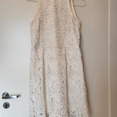 Sort blondekjole med underkjole. Pene detaljer på armer og skjørt. Kjolen sitter litt løst og er veldig fint med et belte i livet. Kjolen er ikke brukt, har ingen anmerkninger og kommer fra røykfritt hjem.