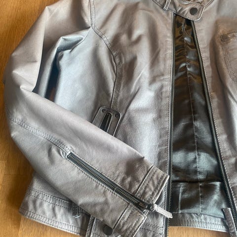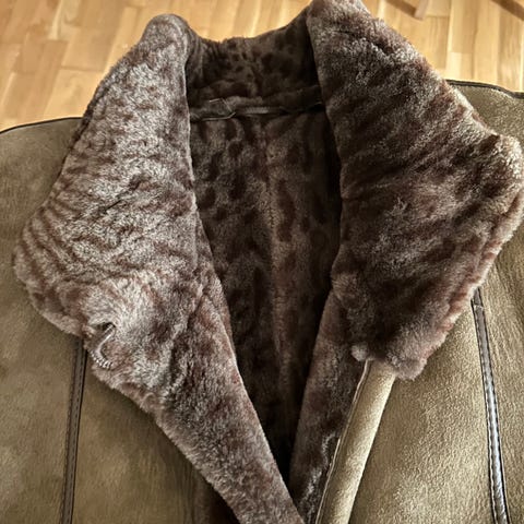Marie Philippe vintage brun skinnjakke, str. XL, kort modell, røft skinn. Jakken er i god stand, har stort sett hengt i skapet de siste 25 årene. Foret er helt og fint.
