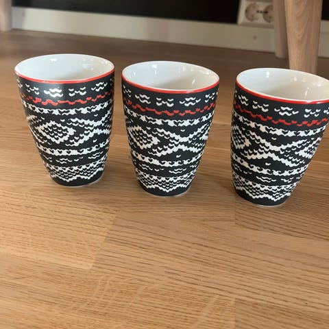 Selger 8 flotte krus med vinterinspirert mønster. Fire røde og fire blå, alle i samme størrelse. Perfekte til kaffe, te eller kakao – og gir en koselig stemning rundt bordet.