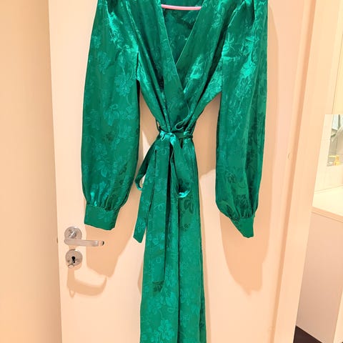 Selger grønn kjole i str. S. Kjolen er i glatt type silkestoff med dyreprint i mønsteret. Fin passform.