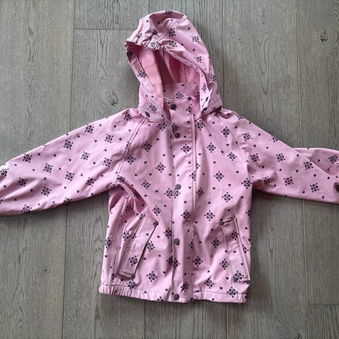 Veldig søt og praktisk jakke i softshell fra Kuling. Pene detaljer og søtt småblomstret motiv. Flere refleksdetaljer for god synlighet. Brukt en gang kanskje. En annen jakke ble favoritt.