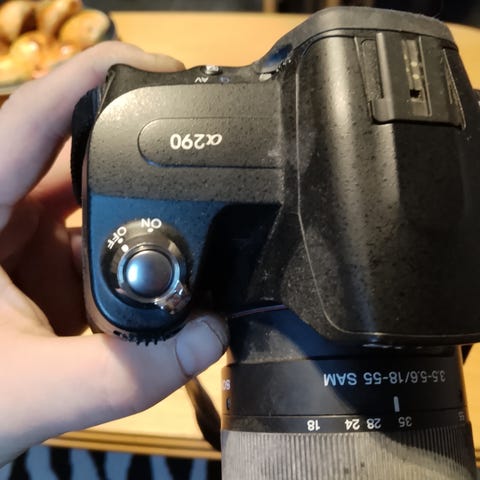 Pent brukt kamera med veske, lader, regntrekk, og ekstra minnekort