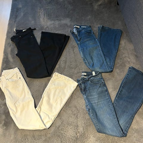 Tydelig slitasje langs linningen og lommene bak.