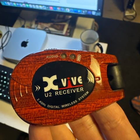 XVive U2 gitar trådløst system. Sett med sender og mottaker for trådløs overføring av gitarsignal. Systemet kobles direkte i gitar og forsterker eller annet utstyr med jack-inngang. Leveres i original eske med dokumentasjon som vist på bildene.