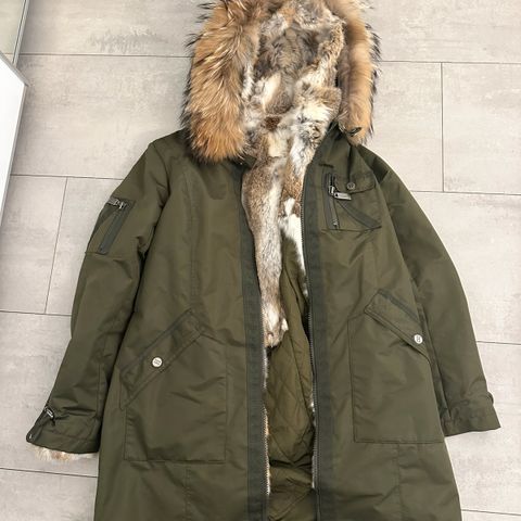 Jeg vil si størrelsen er som en 40 selv om den er merket med 42. Den er veldig god og varm med en nydelig hette foret med kaninskinn. Det er også kaninskinn nederst på ermene. Foret er avtagbart for bruk på vår og høst.