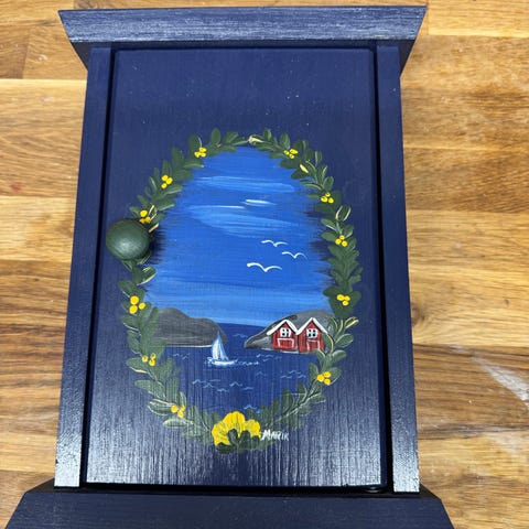 Stilig maritimt nøkkelskap i tre og glass. Fine beslag. Noen bruksmerker, frontplate litt ujevn/bølget og løs, må festes, se bilder.