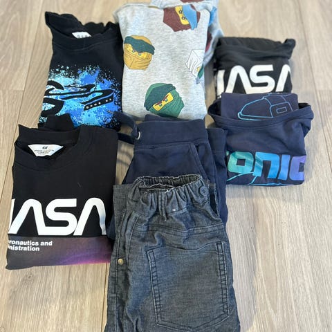 Mesteparten er pent brukt, noe litt mere brukt. Ikke noe hull/skader, men 2 av buksene har blitt satt på strykemerker, Så er det en genser som har litt mørk flekk. Legger til bilde av det. Ellers, masse fint og en del Ninjago. 1 Lewis olabukse og andre klær fra Cubus, h&m osv.