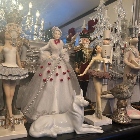 Vintage samling av dekorative gjenstander inkludert en utskåret trehylle, keramiske nissefigurer og en metallramme med portrett. Settet inneholder også en dekorativ skje og en lysestake. Gjenstandene er laget av tre, metall og keramikk, ideelle for dekorasjon eller samling.