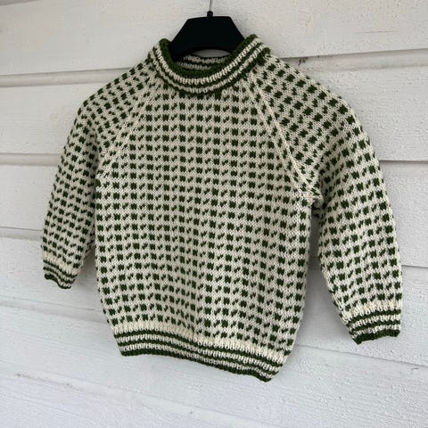 Nystrikket islender i 100 % ull størrelse ca 4-5 år. Hvit med svart mønster. Dale lanolin wool. Ekstra god og varm