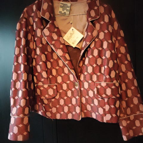 Flott ny og ubrukt blazer jakke fra Baum und Pferfgarten, str S-M,, står størrelse 38 på jakken og vil si den er reelle. Fargen er rødbrun og med svakt champagne gull fargede knapper, de er ganske nøytrale.