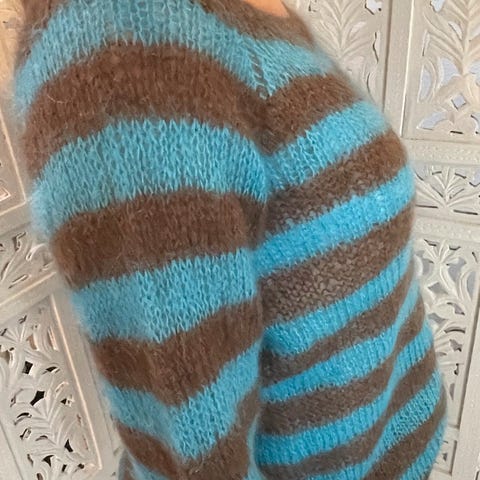 Strikket genser. All bird, oppskrift fra Garnius. Strikket i Merinor Kid silk. Armelengde målt fra monteringskant 43cm. Bredde bol 44cm. Lengde fra skulder og ned 58cm. Ubrukt.