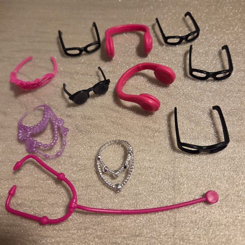 Tilbehør til Barbie-dukken: bærbare datamaskiner, telefon, kamera, videokamera, vekkerklokke, ridehjelmer, blomst, hodetelefoner og mer