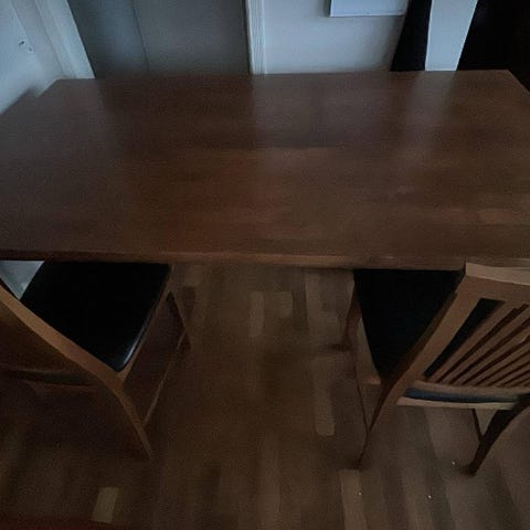 Eldre spisegruppe som har holdt seg utrolig godt - veldig lite bruksmerker! Laget av vakker og hardfør eik. Stoler i kvalitetsskinn.