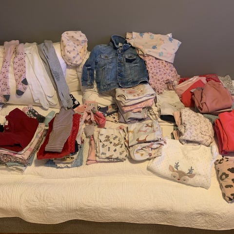 Selger pakke med bomullsklær til jente i størrelse 68. 9 bodyer, 13 bukser, 2 strømpebukser, 13 par sokker, 1 romper, 1 topp, 2 kjoler, 3 pyjamaser, 1 lue, 1 hårbånd og 2 badetruser - av merker som Hust and Claire, Newbie, Lindex, H&M, Name it, Marmar.. Noe godt brukt, mye pent brukt. Se eget bilde for enkelte flekker/misfarging, slitasje. Selges samlet for 400 kr. Kan evt. hentes på Kolnes, Karmøy.
