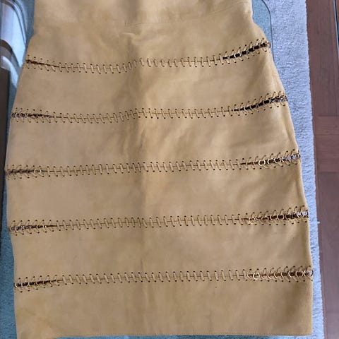 Et skjørt laget av ekte semsket skinn, størrelse 38. Vakkert sydd og fôret, fra det eksklusive merket La Mania. Svært godt brukt. Kom gjerne og se det personlig hvis du vil.