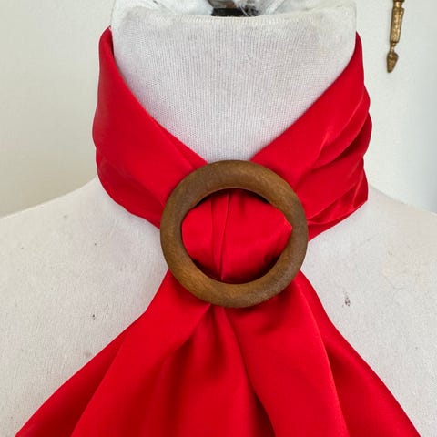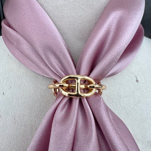 Skjerfring i gull. Lekkert å style skjerfet med. Passer best til små silkeskjerf 53x53cm eller 65x65cm. Skjerfringen er i metall. Den er pent laget og ser eksklusiv ut. Den kan derfor styles på mange måter. Noen eksempler. Skjerfet kan f.eks. lages til en rosett eller sløyfe, Skjerfringen holder skjerfet på plass. Man kan tre skjerfet inn fra hver side og og lage en fin pynt på skjerfet i halsen. Dra gjerne spennen litt til siden slik at skjerfet ligger litt på siden. Denne spennen å asser spesielt godt til silkeskjerf. Kan brukes på andre skjerf også, bare skjerfet ikke er for tykt for hullet i skjerfringen. Skjerfringen er 30x20cmm. Hver åpning i spennen er 12x18mm. Den er ikke tung slik at den sklir på skjerfet. Har denne i sølv også.