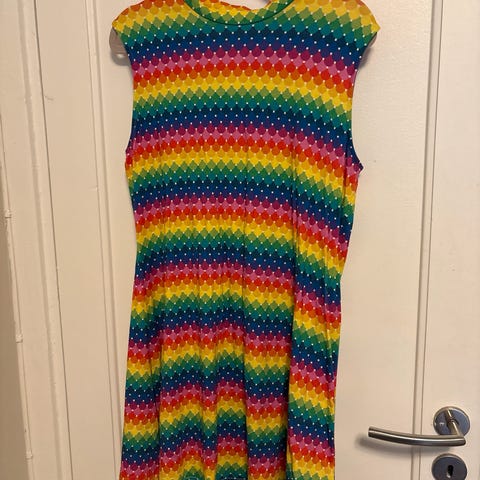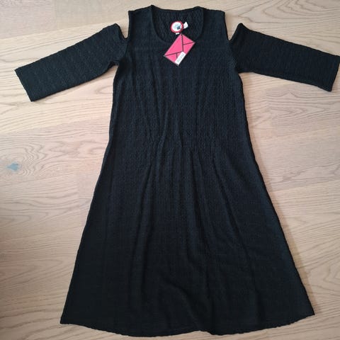 Sporty hette kjole i svart fløyel. Lomme forran og den er litt kortere i sidene. Skikkelig herlig kjole. Knelang. Jeg er 169cm. Str 40. Har tatt bort lappen i nakken da den klør. Gjør det på alle mine klør.