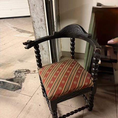 Antikk Dragestol i original stand. Laget av mørkbeiset tre med dekorative dreide ben, utskåret pynt rundt setekant og ryggstøtte, utskåret dragehode på armlener. Setet er polstret med originalt brunt skinn uten skader. Stolen har utskjæringer på ryggstøtten av drager og stolen viser sjarmerende tegn på bruk og alder. Er desverre en liten skade på ryggen der en av hjørnene har løsnet man kan enker fikser med tremil.