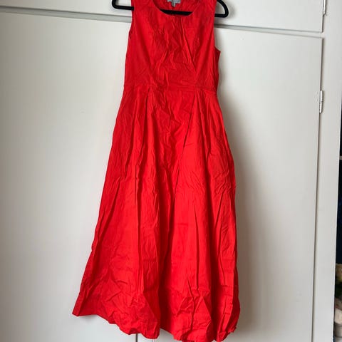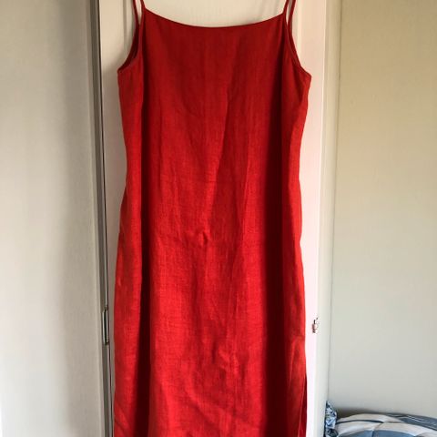 En fin sommerkjole fra Zara, farge-orange,f latterende lengde og fasong. Lin og viskose blanding. Kjolen ble brukt en gang i et par timer. Glidelås bak og sidelommer.