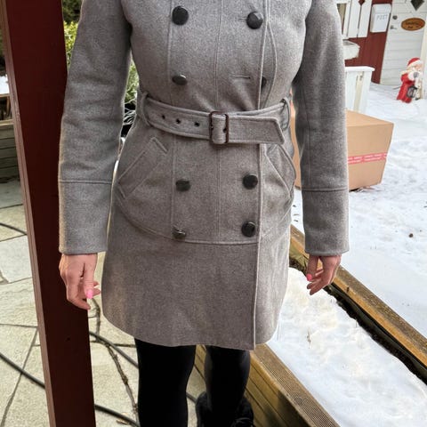Kåpen består av, ytterdel: 65% ull og 35% polyester, fôret er 100% polyester.