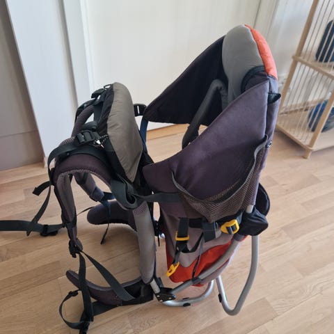 Pent brukt, uten særlige merker, noen flekker muligens som kan vaskes av med klut. Grei bæremeis som kan stilles inn etter rygglengde hos bærer ☺️ Solskjerm og en sekk til det mest praktiske.