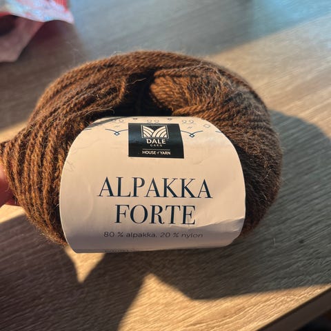 Bystrikk Alpakka Forte garn i brun farge. Laget av alpakka og andre materialer for en myk og slitesterk kvalitet. Egnet for strikkeprosjekter som gensere, skjerf og luer. Fargenummer og parti vises på bildet.