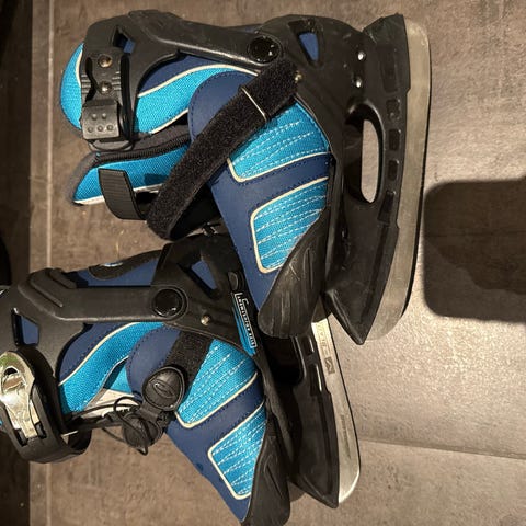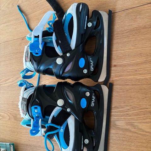 Selger pent brukte skøyter til små barn. Kan justeres i lengde og festes på sko.