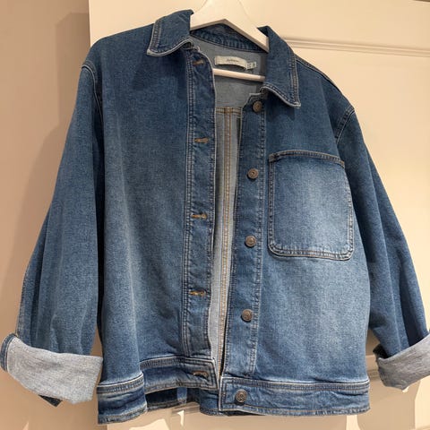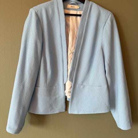 Flott jakke med små skulderputer. Meget pent og lite brukt ( ingen brukstegn). Har veske og halskjede i samme farge du kan få kjøpt til. Flott høstjakke.