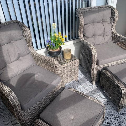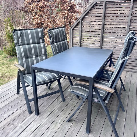 Komplett hagesett – bord + 4 stoler med puter