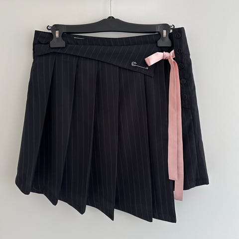 Topp og skjørt i strikket kvalitet. Nydelig sammen eller hver for seg. Toppen er str L og har splitter i siden. Skjørt i str M med folder og elastisk midje. Nydelig kvalitet, i meget god stand. 88 % viscose og 12 % polyester. Kan selges sammen eller separat: topp 450kr, skjørt 400kr, samlet 850.