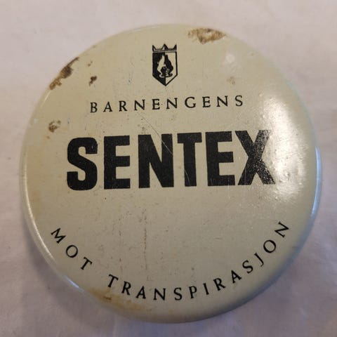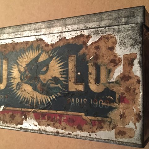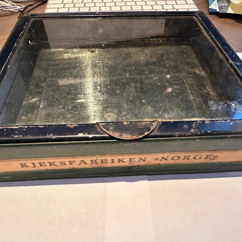 Kjeksboks med flott utside. Innsiden viser at boksen har blitt brukt.