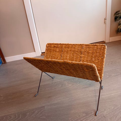 Super fin, vintage avis/magasin kurv i rutete stoff. Trehåndtak og metall. Er i meget god stand. Høyde ca 50 cm, lengde ca 38 cm og dybde 17,5 cm. Se bilder. Kan sendes om kjøper betaler porto.