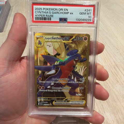 Selger de originale pappfigurene med bakgrunn fra Pokémon TCG: Cynthia’s Garchomp ex Premium Collection.