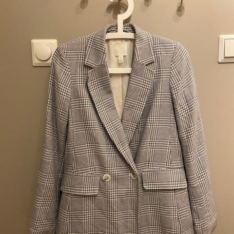 kjøpt i London på New Look for over 25 år siden, sort med beige pin stripes, foret, gode lommer og hekte til å lukke den.