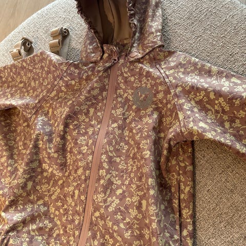 Jakken må vaskes, men finner ingen feil/ hull på den. Buksen må vaskes og har bruksmerker. Merkene på knærne bør teipes, det er begynnende hull. OBS: Dette er en tynn regndress som er fin ved lett regnvær, ikke særlig egnet for mye vær. Størrelsen 152, men opplever den som mindre.