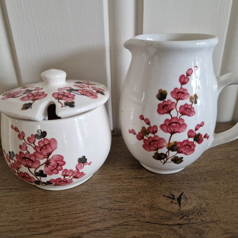 Porselen kryddersett med tre beholdere, hver med lokk og skje. Settet har et vakkert blomstermønster i rosa og grønt på hvit bakgrunn. Perfekt for oppbevaring av krydder eller som dekorativt element på kjøkkenet. Leveres med matchende brett for enkel organisering.