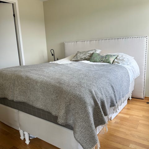 Grå farget seng med madrass med over madrass.