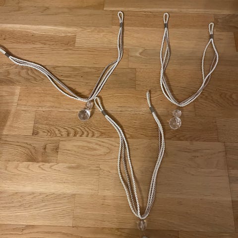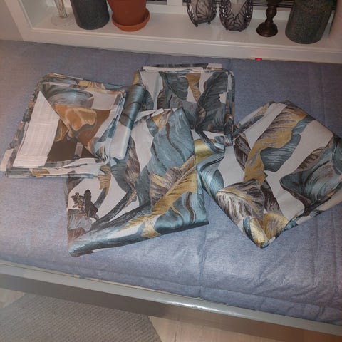 2 stk gardinhøyder 2m lang. Usikker på materiale da lappen er borte. Kremfarget med mønster. Kan sendes for 69kr