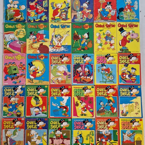 Disney Onkel Skrue tegneserieblader samling. Pakken består av flere hefter med ulike utgaver av Onkel Skrue-serien. Tegneseriene er i farger og i standard bladformat. Egner seg for lesing, samling eller komplettering av eksisterende samling av Disney-tegneserier.